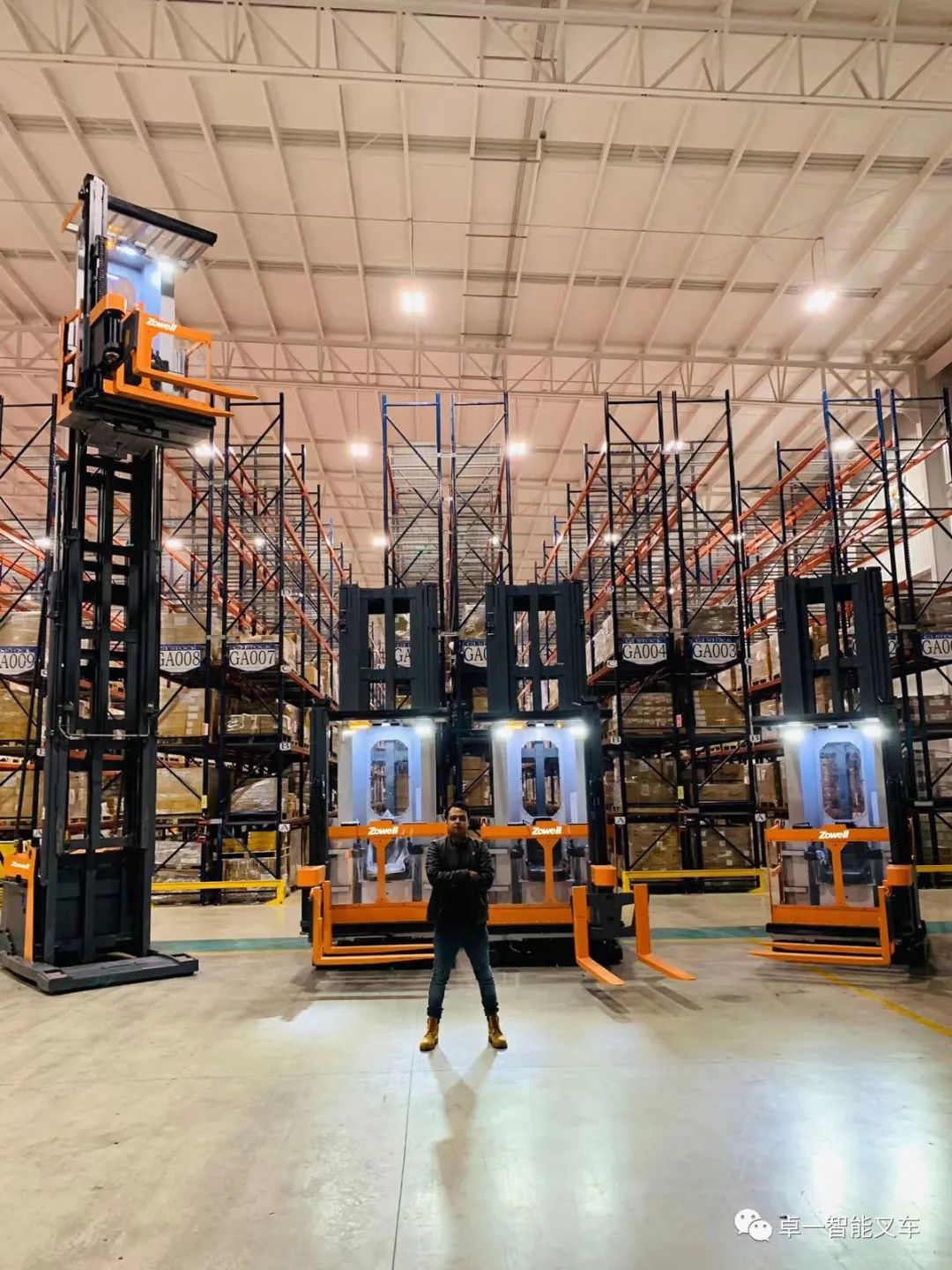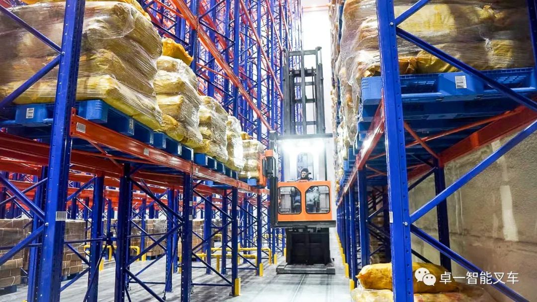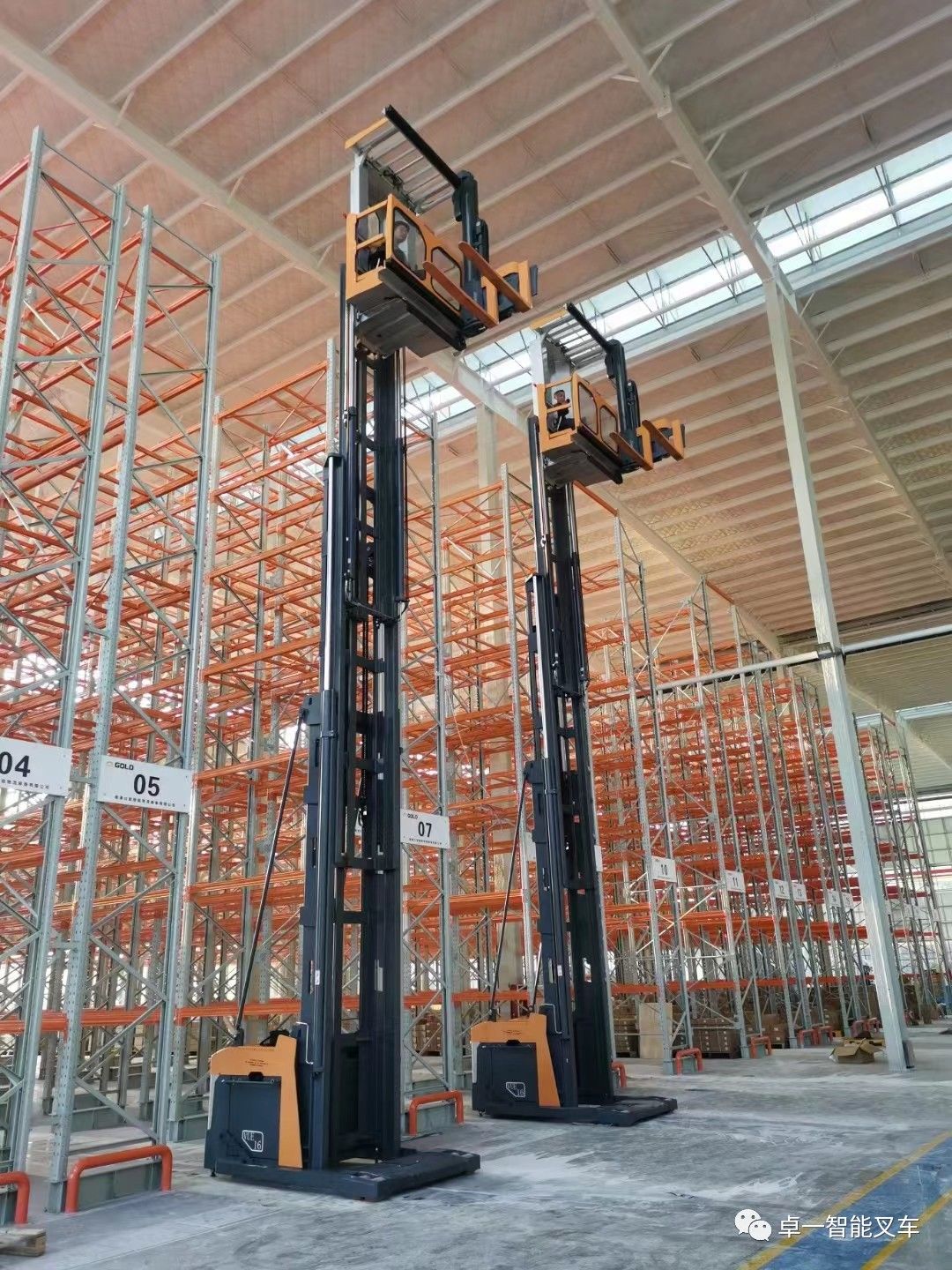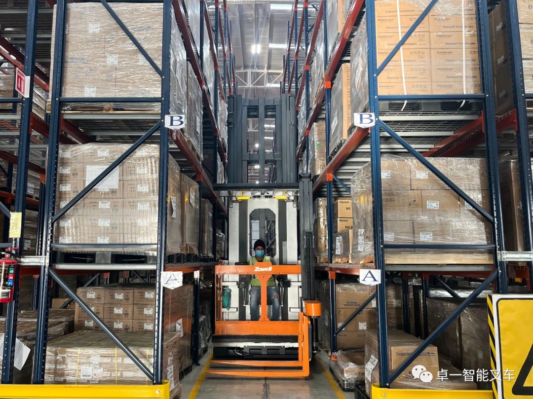 客户此前使用的铰链式叉车载荷能力过于局限,负载900kg以上货物起升至6m时就会产生失载风险。卓一人上行三向叉车,失载率低,负载1.05吨货物可至10m不失载,绝对程度上负担大吨位料箱高位堆垛,保证作业安全。