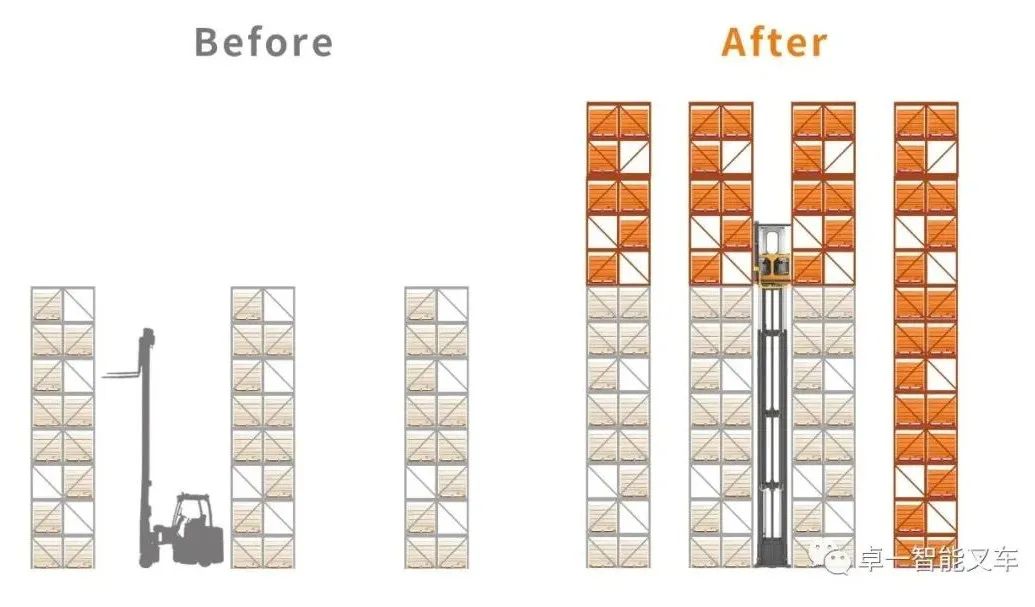 原始货架通道宽度>2.2m,可利用库位分散,配备铰链式叉车进行堆垛作业,车辆最大起升高度6m,仓库的高位空间也处于闲置状态。企业货架规划升级后,巷道宽度仅为1.8m,铰链式叉车进入巷道容易撞击货架,无法顺利完成堆垛需求。