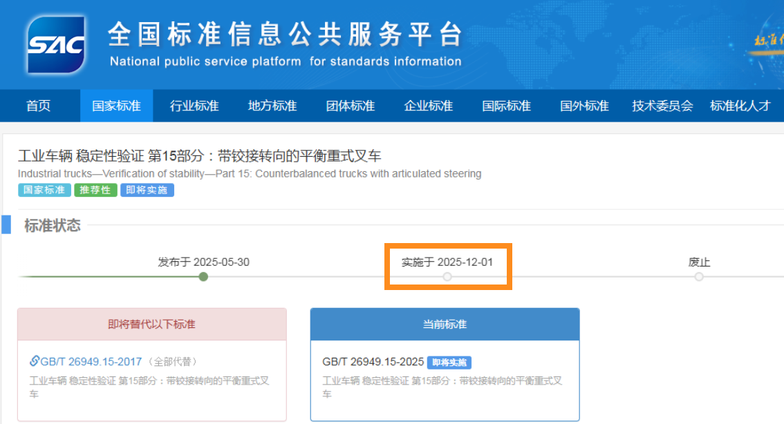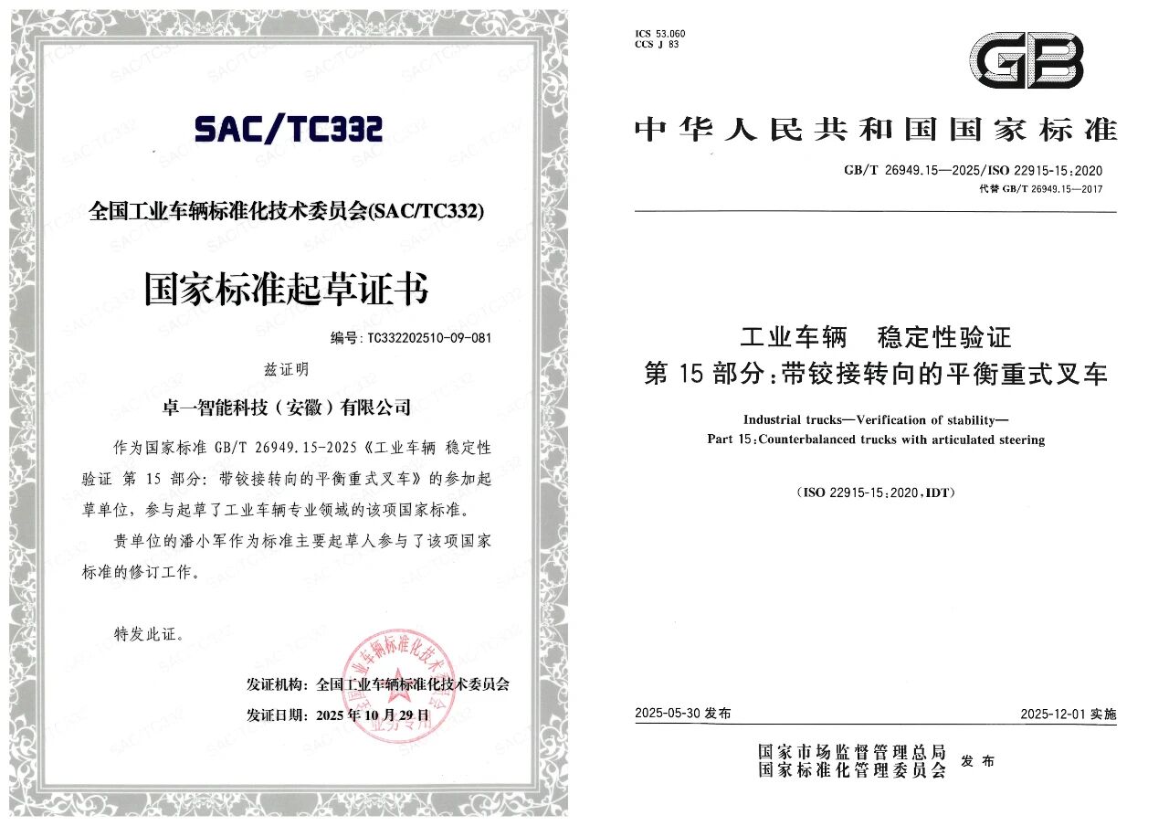 根据全国标准信息公共服务平台显示,由卓一智能叉车作为参加起草单位之一的国家标准《工业车辆 稳定性验证 第15部分:带铰接转向的平衡重式叉车》已于2025年5月30正式发布,并将于 2025年12月1日实施。卓一智能叉车总经理潘小军先生作为标准主要起草人,参与了该项国家标准的修订工作。