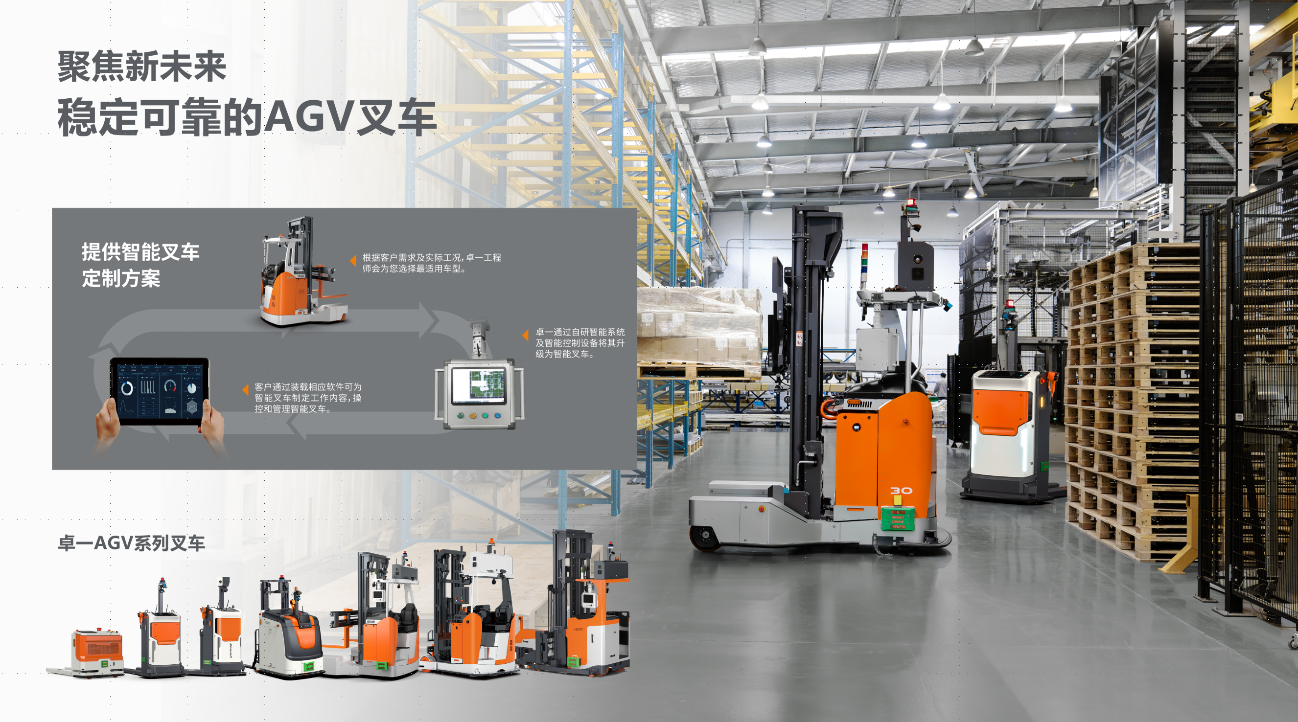 另外,此次演讲中还重点介绍了卓一在窄巷道AGV方面的进展。卓一工程师会根据客户需求及实际工况推荐最适用的车型,并可通过自研智能系统及智能控制设备将其升级为智能叉车,实现窄巷道AGV的智能调度与管理,在提高存储效益的同时进一步提升客户物流自动化水平。