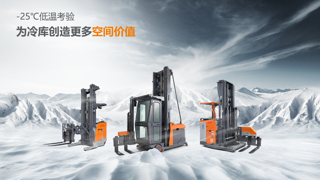 经卓一全面改造后的冷库专用人上型三向叉车,车身和门架都做了防锈处理、对液压油、齿轮油、电磁阀等液压系统进行了专业级别的防冻处理,能够有效应对冷链仓储物流行业面临的库容不足、叉车液压系统冻结、行驶过程中打滑等痛点,在最低-25℃环境中依然可以稳定运行,助力客户实现更高存储密度、更安全高效的冷链物流。