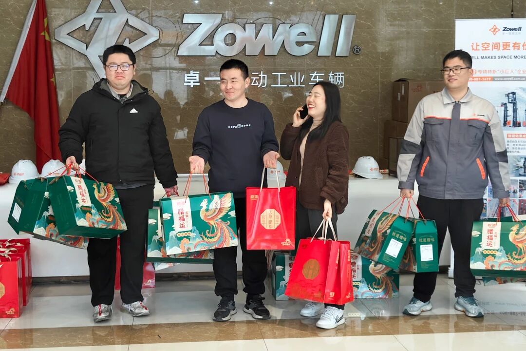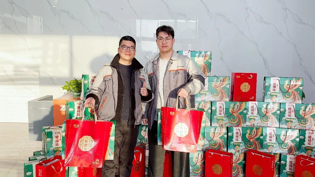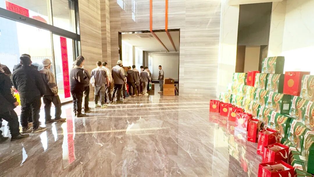福利发放现场,各部门热热闹闹排队领取,年味随着礼盒传递,欢声笑语不断。