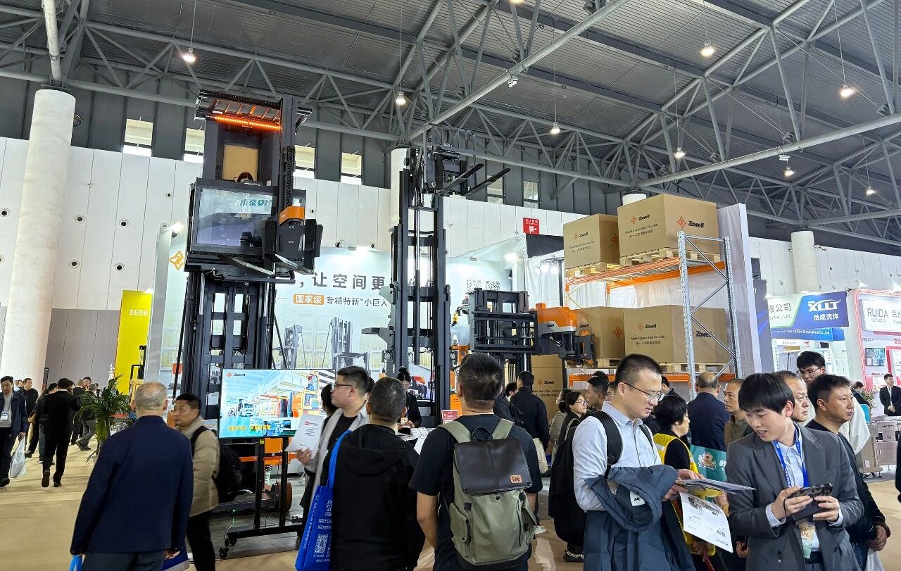 动态演示区,窄巷道三向AGV叉车在模拟场景中自主行驶、堆垛,展现了无人化作业能力,现场客商纷纷驻足拍照。