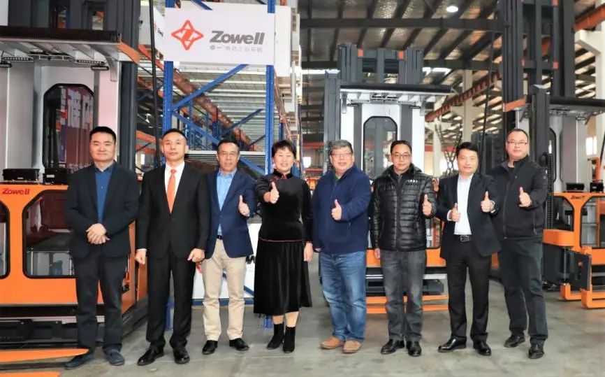 应卓一智能叉车邀请,中仓协技术应用工程服务分会常务副会长王祖锦、中国叉车网总经理胡扬波、制慧网CEO方谊勇等嘉宾为4台卓一VUE人上行三向车新品揭幕。