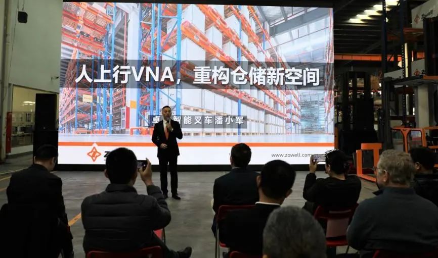 卓一智能叉车副总经理吴延涛在欢迎词中表示,感谢与会嘉宾百忙之中专程来到会场,介绍了卓一在窄巷道叉车领域的探索和坚持,让大家对卓一窄巷道产品的技术实力有了新的认知,矢志不渝,不忘初心,卓一将在窄巷道领域不断深耕,把更多性价比的产品交付给全球客户。